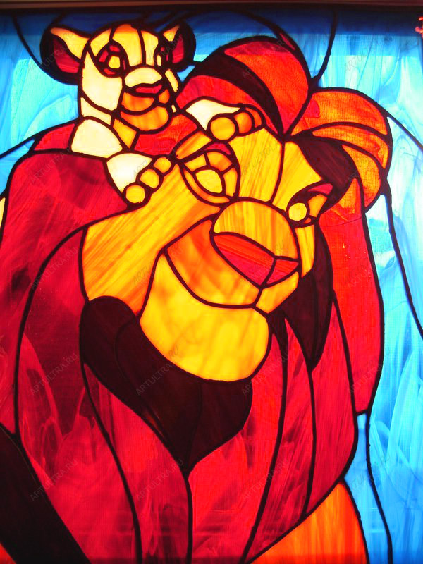Мультяшный витраж – лучший способ впустить в свой дом кусочек детства. Кто из нас не любит мультики? Даже встав взрослыми, мы все равно возвращаемся детство, просматривая шедевры мультипликации уже со своими детьми. Одним из любимых, бесспорно, можно назвать бессмертный мультфильм «Король лев». На картине изображен один из самых добрых и трогательных моментов: Муфаса и Симба – отец и сын играют вместе. Кстати, именно в этот момент Симба спросил отца: «Мы друзья верно? И мы всегда будем вместе».