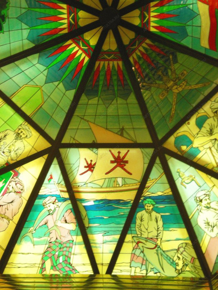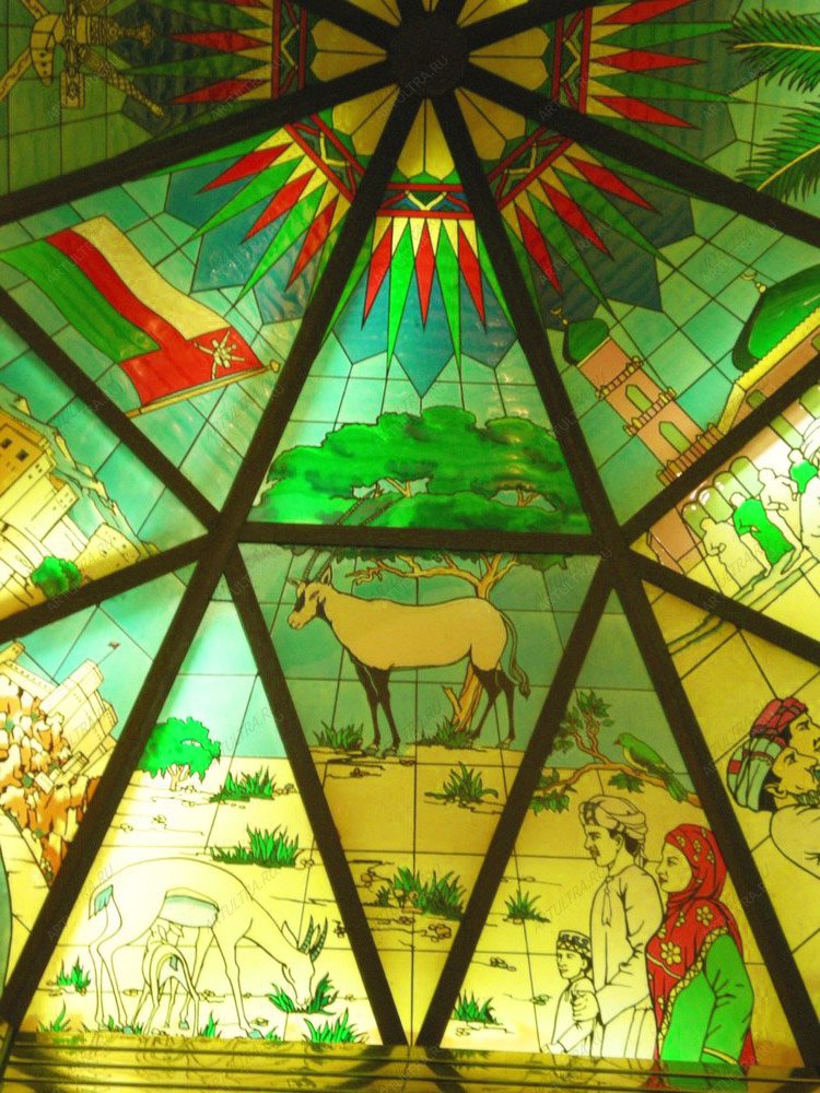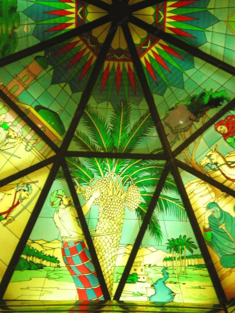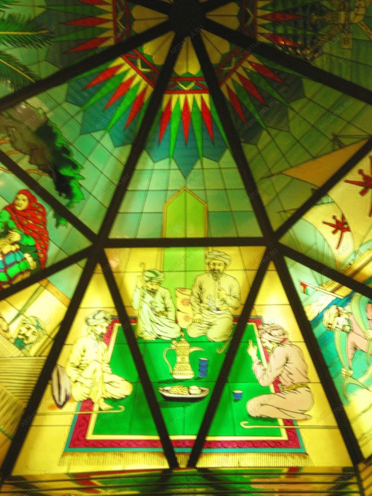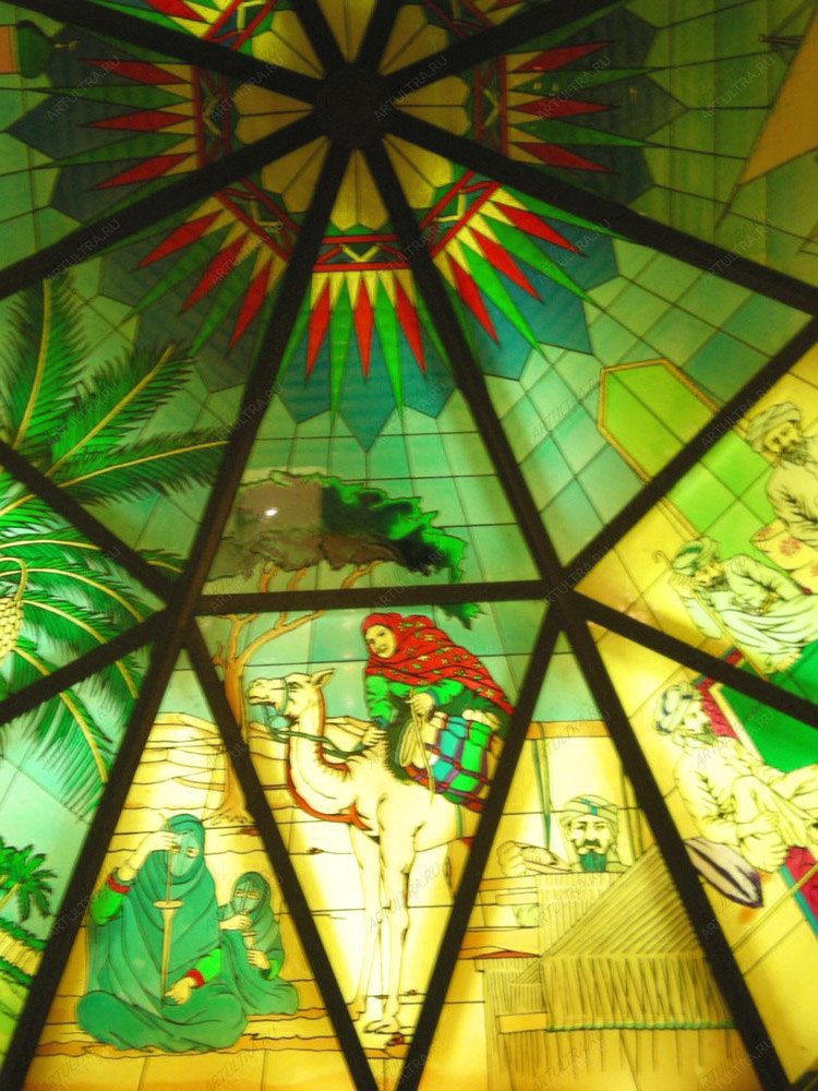 Мусульманские витражи прекрасно подойдут для украшения мечетей и других мест, куда приходят люди, приветствующие ислам. Такие окна станут украшением помещения и помогут настроиться на нужный лад. Восточные традиции витражного искусства появились еще в 15 веке, но и в наши дни этот удивительный обычай также широко распространен. Окно разграничивают треугольники, каждый из которых состоит из цветных фрагментов стекла, соединенных пайкой из олова. Всю композицию удерживает медная лента, которая придает изделию прочность. На картине изображен мусульманский храм, мужчины, играющие в нарды, воины, идущие на бой и караванщик.