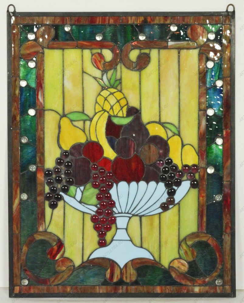 Композиция состоит из 142 деталей, тщательно обработанных стеклорезом. Особая технология пайки удерживает их вместе, а лента из меди усиливает конструкцию. Работа относится к самому высокому уровню сложности, но за счет соблюдения всех тонкостей смотрится очень эффектно, а также отличается долговечностью. Экологически чистые материалы отвечают всем требованиям безопасности для здоровья. Техника Тиффани придает рисунку объем и реалистичность, поэтому натюрморт в стиле витраж станет достойным украшением любого помещения.