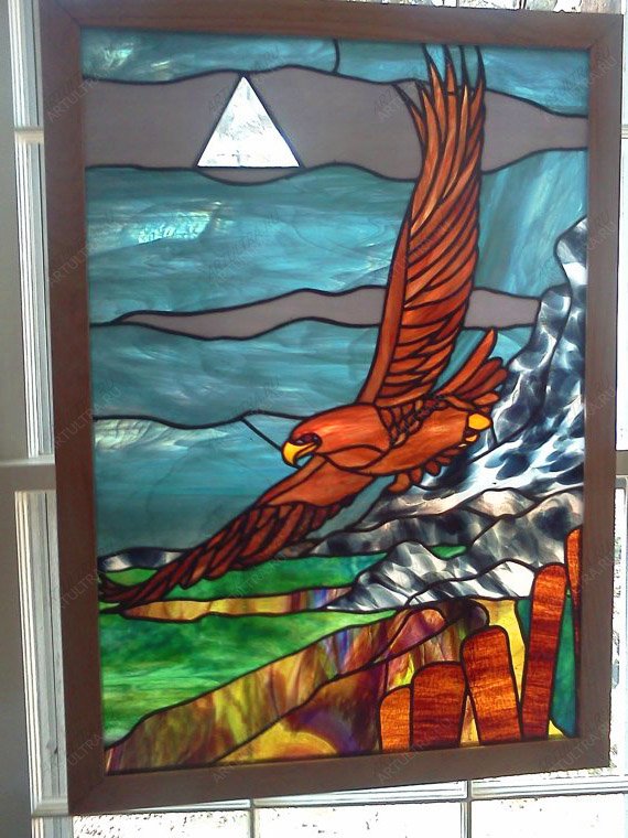 Витражное окно с орлом выполнено в ненавязчивой цветовой гамме, поэтому такой рисунок будет прекрасно сочетаться с любым дизайном, став прекрасным дополнением к нему. При солнечном свете картина удивительно меняется: гордая птица летит на фоне восходящего солнца, а река и горы наполнены мистическим сиянием. В пасмурную же погоду такое окно прикроет унылый пейзаж и принесет в дом частичку лета.