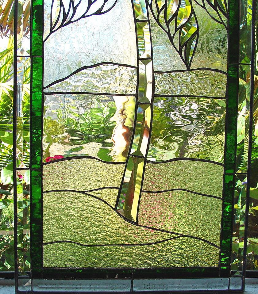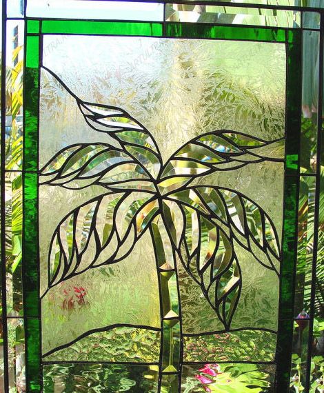 Данное окно с фацетом смотрится не просто необычно, но и очень оригинально, оно собрано из пятидесяти одного элемента, которые имеют разные срезы на внешнем слое стекла. Благодаря этому, пейзаж с пальмой выглядит таким сияющим и производит интересный визуальный эффект. Витражное окно изготовлено из прозрачного рельефного стекла, за исключением материала яркого насыщенного цвета в обрамлении рамы. Рельефные и фацетные элементы по-разному переливаются в солнечных лучах, создавая необыкновенную атмосферу тепла и уюта.
