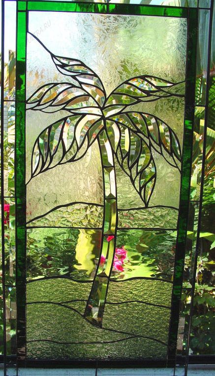 Такое красивое окно с фацетом подойдёт практически к любому интерьеру, начиная от классического стиля и заканчивая современным, главное, чтобы пейзаж с пальмой не противоречил остальным декоративным элементам. Это универсальное украшение вашей гостиной или столовой комнаты придаст обычному солнечному освещению необыкновенную мягкость. При этом, благодаря ненавязчивому узору, оно никогда не надоест, а переливы света и сияющие грани стекла всегда будут вызывать только восхищение.