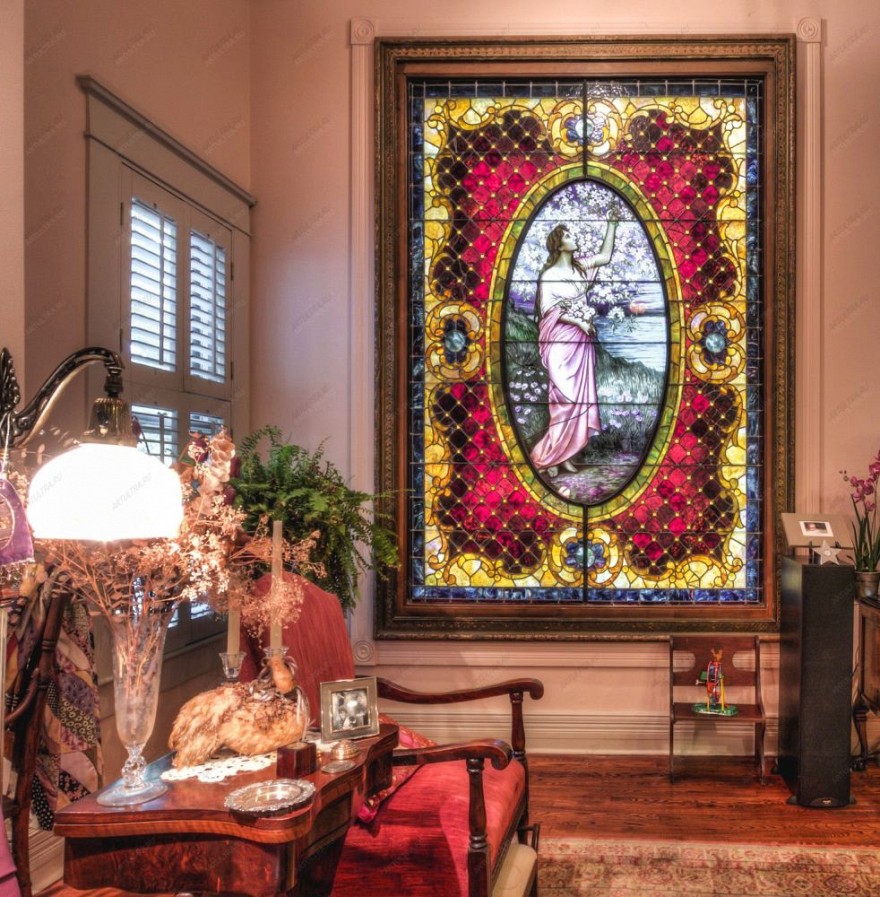 Техника, в которой выполнено окно – комбинированная. Она включает в себя несколько видов исполнения. В ее основе лежит техника Тиффани, гармонично сочетающаяся с росписью отдельных элементов витража. Для создания такой композиции потребовалось 1576 деталей, использовалось стекло Spectrum и силикатные краски. Использование техники Тиффани при остеклении витража – одно из самых популярных решений среди остальных традиционных технологий. Для создания объемных картин, занимающих большие площади и включающих в себя совмещение огромного числа деталей, требуется мастерство и высокий профессионализм людей, занимающихся изготовлением витражных окон. Трудно представить себе человека, который останется равнодушным при виде такой роскоши. Остекление витражами удовольствие не из дешевых, но оно того стоит. Нет никаких оснований отказать себе в возможности преобразить свою жизнь и сделать ее сказочно прекрасной.