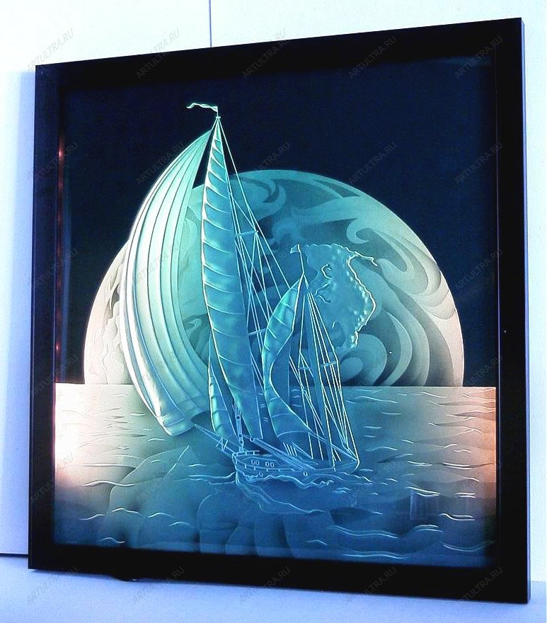 Пескоструй “Море” выполнен при помощи техники цветной пескоструйной обработки. Он очень эффектен и необычайно оригинален. Но особый эффект витражной картине придает грамотная подсветка. Она может быть или внешней, или торцевой. В нашем случае изделие оснащено торцевой подсветкой. Сочетание глубокого цветного пескоструя и торцевой подсветки придает изображению реалистичность и иллюзию объема.