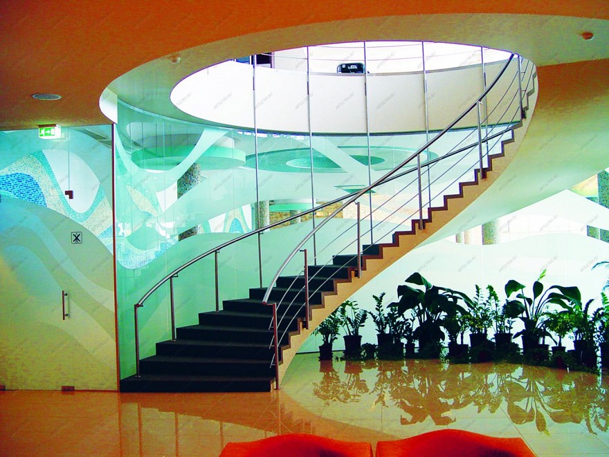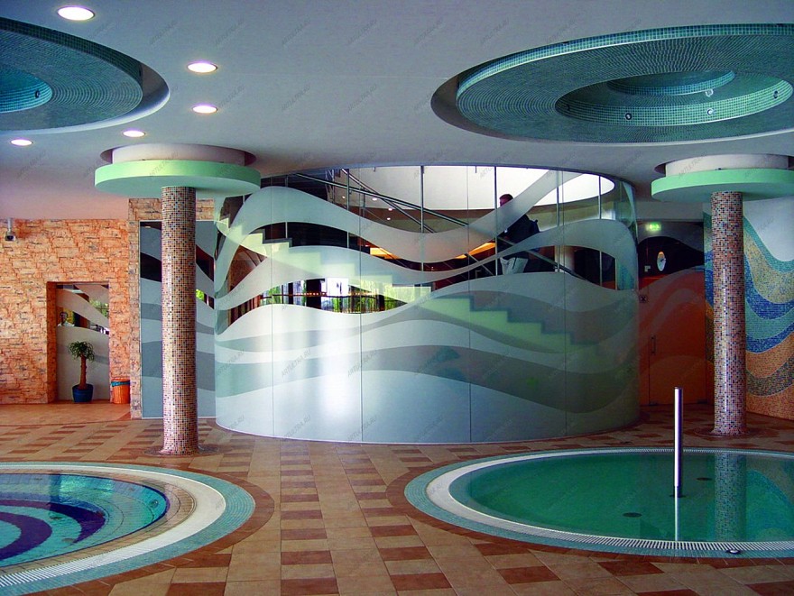 Пескоструй здания – смелый ход дизайнеров. При помощи этой техники они создали уникальные детали интерьера, которые задают стилистику всему зданию. Архитектурные элементы строения, украшенные легкими, нежными и простыми матовыми рисунками, позволили художникам создать неповторимый шедевр дизайнерского искусства. Тон, заданный дизайнерами, красной нитью проходит и определяет интерьер здания. Стекло, обработанное пескоструйной машиной, использовано при оформлении внутренних стен здания, лестничных маршей, дверей и перегородок, что придает им торжественность и оригинальность.