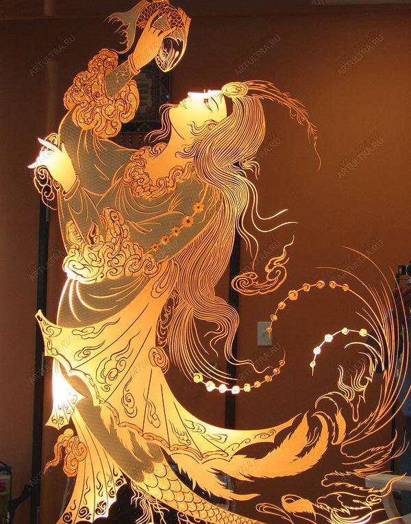 Пескоструйный рисунок девушки на зеркале – очень красивое и благородное декоративное оформление для зеркал. Золотистый оттенок витража внесет солидность, богатство и величие в ваш интерьер. Таким образом можно преобразить дизайнерскую обстановку в доме, придав ей совершенно новый вид, а также скрыть от посторонних глаз какие-то нежелательные участки в комнате, например, разместив такой витраж на дверцах шкафа купе. Если же вы являетесь обладателем малогабаритной квартиры, у вас есть реальный шанс визуально расширить пространство, раздвинуть стены, сгладить углы, видоизменив помещение.