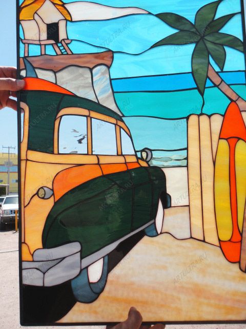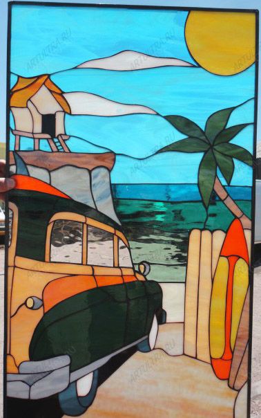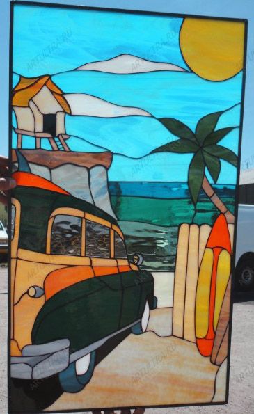 Море, пальма, ретро-автомобиль и доска для серфинга, ну и, конечно же, солнце, которого так иногда не хватает в пасмурные дни. Глядя на этот витраж, понимаешь, что счастье состоит из простых и приятных вещей.