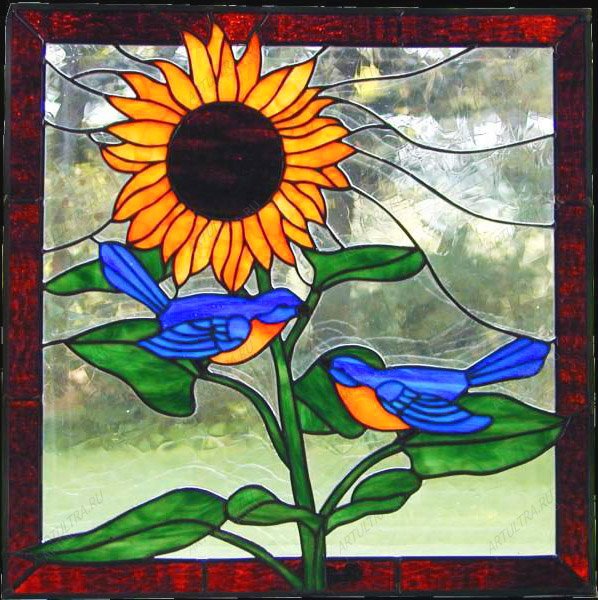 Создание такого изделия относится к работе средней категории сложности. Собирается оно из 56 цветных стеклянных элементов зарекомендовавшей свое имя марки Spectrum. На изготовление подсолнуха в витраже специалистам потребуется не менее трех двух недель. Предоставляемая гарантия на него составляет 12 лет.