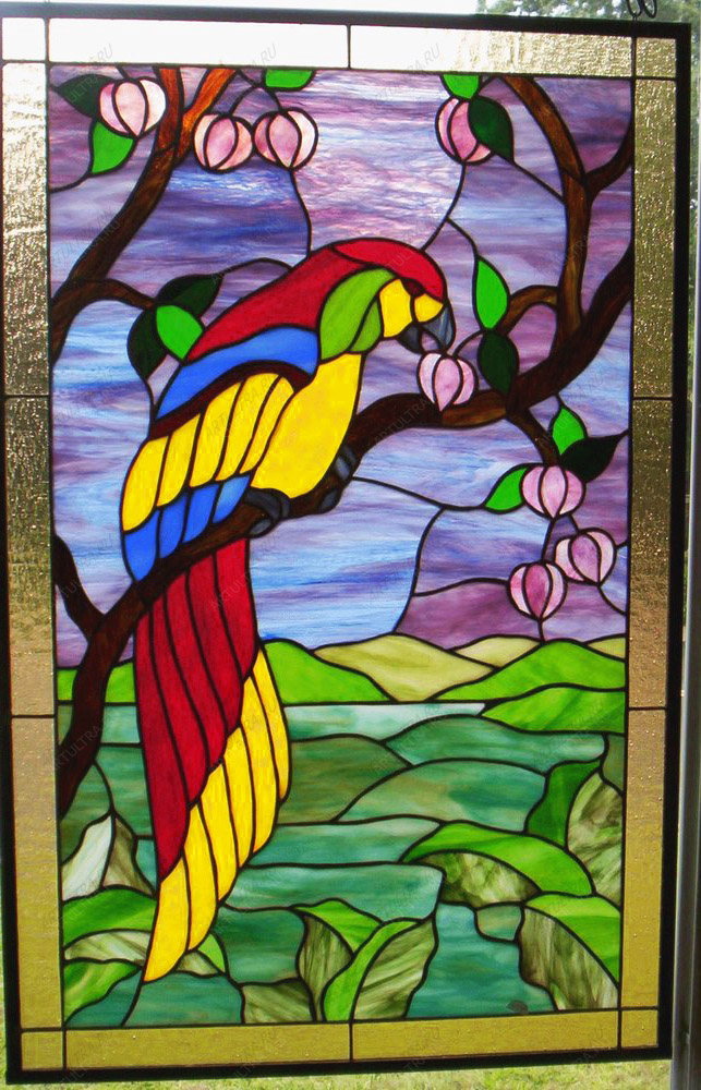 Попугай в технике Тиффани станет достойным украшением вашего дома. Яркая эффектная картина напомнит об Африке и экзотическом отдыхе. На рисунке изображен попугай породы ара, а он, между прочим, самый крупный представитель семейства. Как и положено, птица изображена в кричащих оттенках. Попугай в технике Тиффани сидит на цветущем дереве, на фоне закатного неба. Такая картина внесет ослепительный позитив в любое помещение. Считается, что такая картинка – это идеальный вариант для гостиной или прихожей, а также она будет уместна в детской комнате.