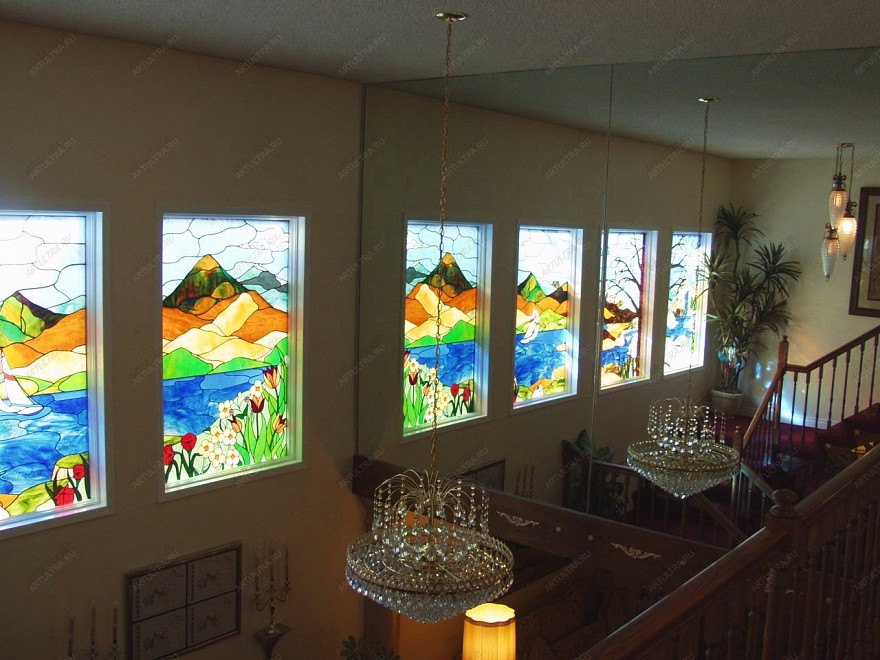 Мода украшать дома витражами пришла к нам из глубины веков, но сегодня это тренд, поэтому те дома, хозяева которых понимают и чувствуют моду, давно декорированы таким способом. Уход за природным витражом совсем не сложный: он периодически моется влажной салфеткой для стекла. Если вы хотите по-настоящему стильный, уютный и модный дом, то природный витраж станет отличным решением. Кстати, считается, что изображение, на котором запечатлены вода и горы, способно приманивать деньги. По этой причине такой декор может стать своеобразным талисманом для вашего домашнего очага. Подарите своему дому удивительную душевную обстановку и яркие краски, установив природный витраж в качестве наружных окон.