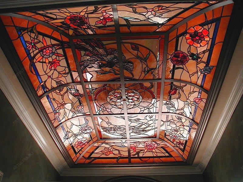 Работа по созданию композиции очень кропотливая и имеет высокую категорию сложности, требующую достаточного времени, а именно, около полутора месяцев. Но полученный результат просто поразит ваше воображение. Тем более, что витражный потолок имеет функцию освещения, а это значит, что при включенной подсветке преломляющие свет стекла эффектным образом заиграют, создавая переливы различных оттенков. Предоставляемая гарантия на изделие составляет 12 лет.