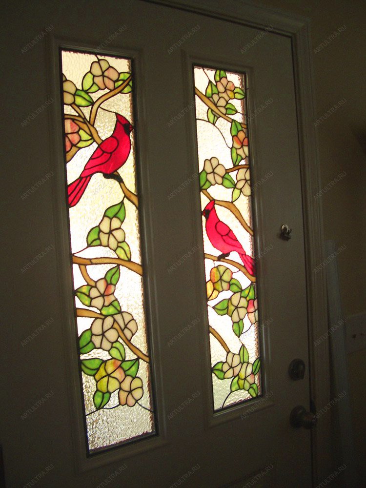 Птицы на витраже – подходящий современный красочный декор для оформления межкомнатных дверей, выполненный в технике Тиффани. Органично вольется в интерьер любого стиля, т.к. тема природы, а именно, растительности и птиц, как на фото сверху, является универсальной по отношению к любому дизайну.