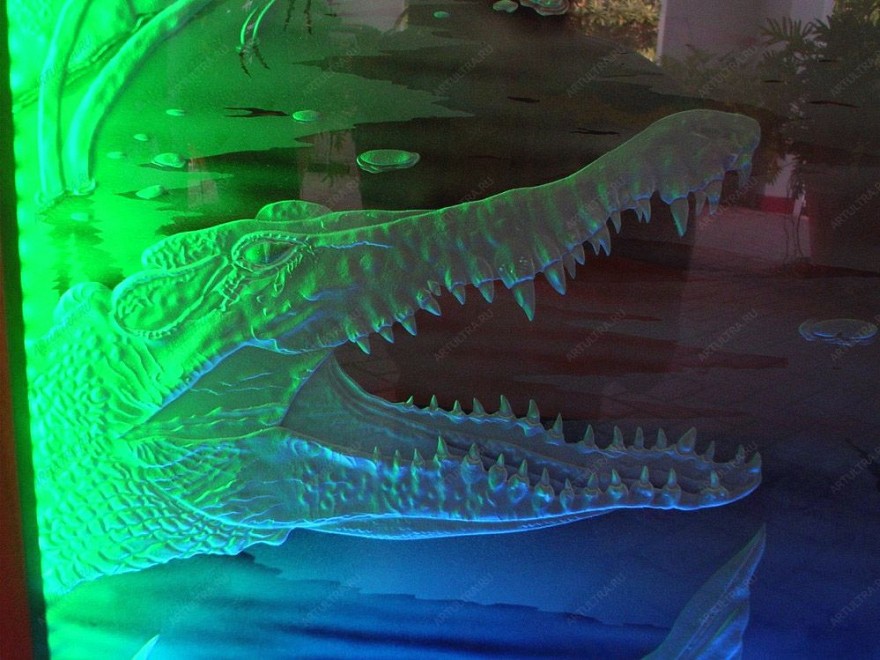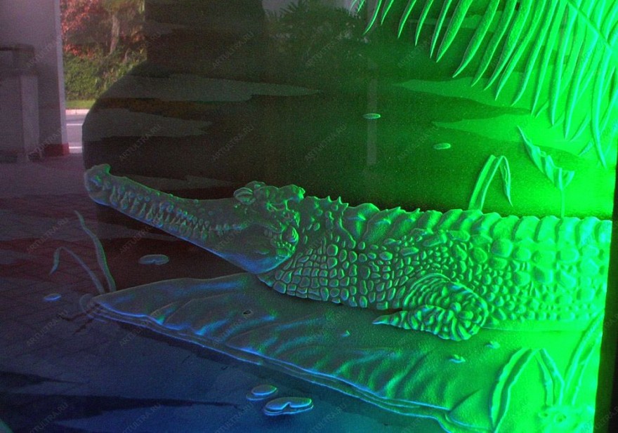 Рельефный пескоструй не случайно выбран для декора распашных дверей: это оригинально, необычно и просто очень красиво. Облака, растения, множество птиц и даже кровожадные крокодилы поселились на этом чудесном витраже. Такое нестандартное решение для «наряда» дверей по достоинству оценят и взрослые и дети. Рисунок завораживает своей реалистичностью, но самое интересное начнется тогда, когда стемнеет и включится светодиодная подсветка: витраж оживает и кажется, что сейчас в комнате запоют птички и воздух наполнится свежестью речного воздуха. В комнате можно будет обойтись без дополнительного освещения, т.к. этот витраж выполнит еще и функцию торшера или светильника, создавая в помещении романтичную, интимную обстановку.