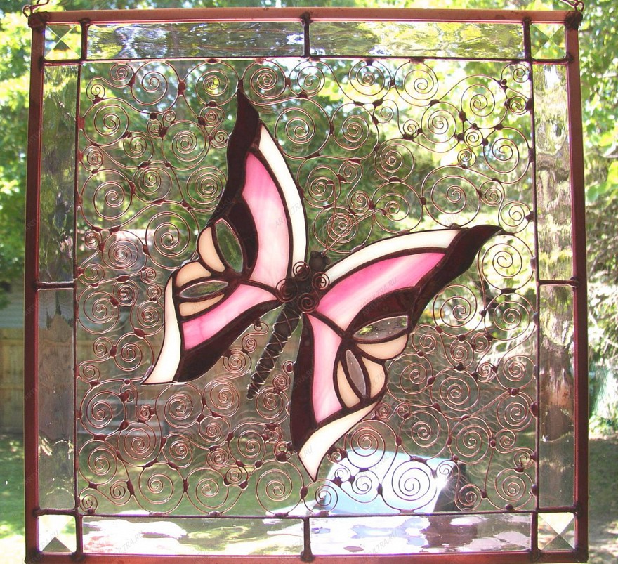 Такой пейзаж будет уместен в любом помещении. Бабочка выполнена практически в одной цветовой гамме. При этом разница цвета почти незаметна, так как задействован мягкий переход оттенков. Утонченное обрамление из медных спиралей делает картину изысканной и даже роскошной, что придает ей нотку аристократизма. Считается, что бабочка приносит удачу в амурных делах, поэтому опытные дизайнеры часто рекомендуют ее вешать в спальне, напротив кровати. В некоторых верованиях бабочка является символом «легких» денег, поэтому еще принято вешать рисунок бабочки в витраже в кабинете.