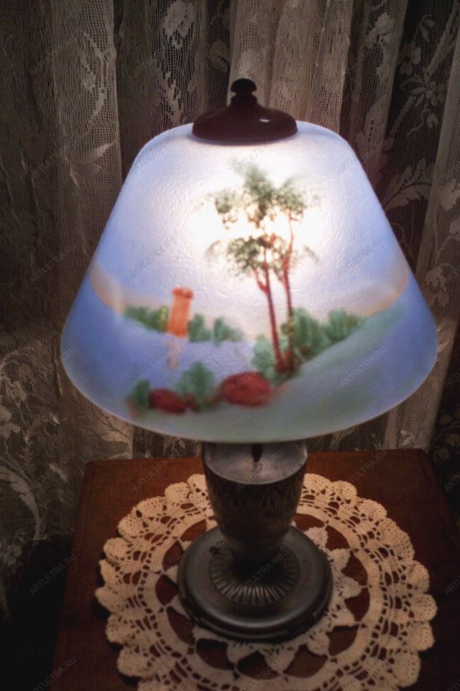 Роспись абажура – это один из удивительных способов придать любому помещению лаконичный вид, добавив в него лишь одну маленькую деталь. Настольные лампы есть практически в любом доме, именно они призваны создавать нежный полумрак и уютную вечернюю обстановку. Вместо скучного абажура грамотные дизайнеры предлагают использовать витражную роспись, тогда комната начинает преображаться и на нее можно взглянуть по-новому. Сейчас на пике моды японские и арабские стили, есть мнение, что именно такой способ декора является психологически комфортным и утонченно красивым. Тонкое дерево на фоне ярко-синего неба и моря с маяком на заднем плане вызывают умиротворение одним своим видом. Плюс, при включении лампы, пейзаж становится кардинально другим, более ярким, что тоже довольно необычно.