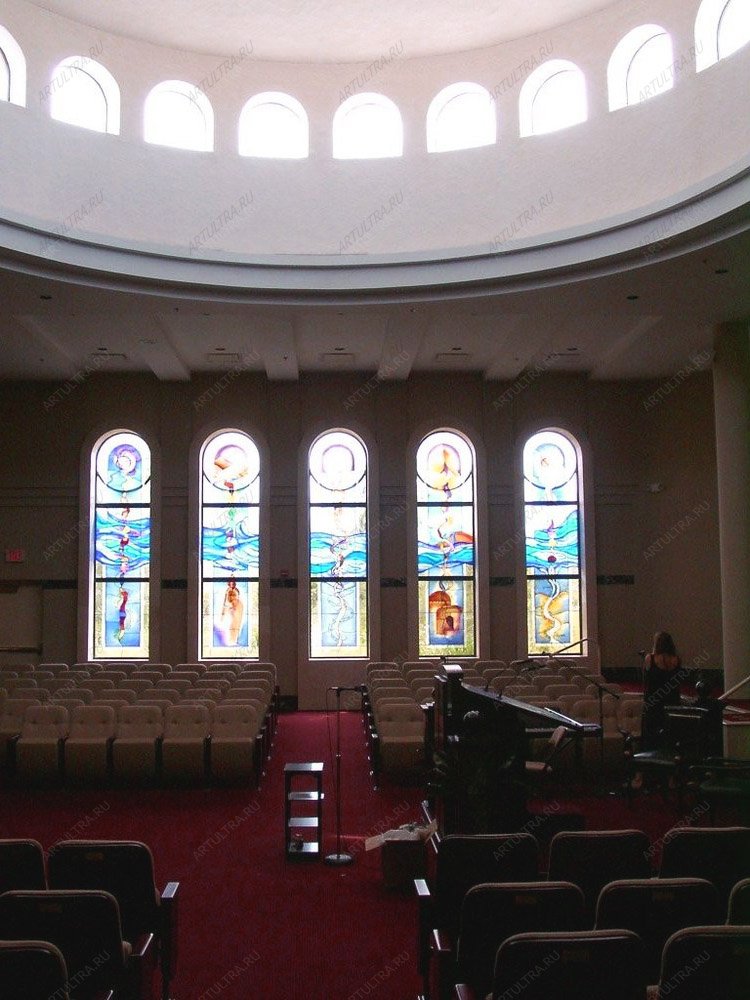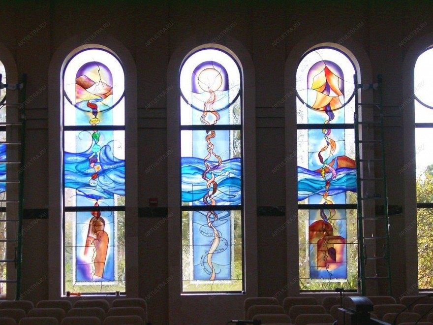Роспись по стеклу церкви – декор для окон, замечательно подходящий по своему стилю и тематике к религиозным заведениям, созданный при помощи техники художественной росписи, оптимальной для таких габаритных окон.