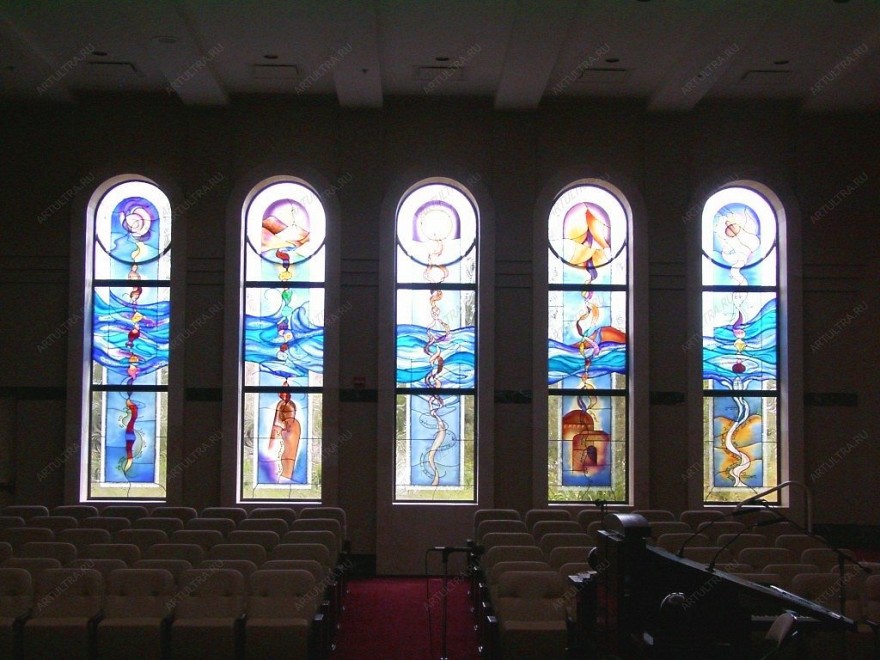 Художественная роспись является наилучшим выбором для декорирования крупногабаритных окон. Кроме того, витраж прекрасно скрывает происходящее внутри от посторонних глаз, избавляя тем самым от необходимости использования штор и занавесок. Роспись по стеклу церкви, выполненная на окнах, наиболее выигрышно смотрится за счет того, что когда на нее падает дневной свет, солнечные лучи преломляются и начинают играть по-особенному. Можно долго наблюдать за происходящим зрелищем и наслаждаться красками и линиями замечательных узоров.
