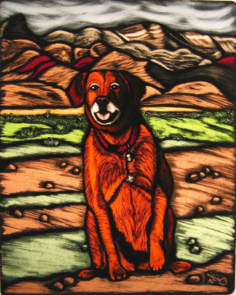 Роспись собаки по стеклу помимо своих эстетических свойств и оригинального внешнего вида, способна вписаться в стилистику интерьера любой комнаты, прекрасно дополняя ее своей необычностью. Для изготовления росписи используются акриловые краски высочайшего качества. Сложность выполнения работы относится к категории сложной. Следует отметить, что краски очень быстро высыхают и обладают хорошей кроющей способностью. Также у них очень яркие насыщенные цвета, которые не выцветают со временем и не выгорают на солнце, а после высыхания образуют стойкое покрытие. Однако есть некоторые особенности, например, одна из них заключается в том, что после высыхания краски немного темнеют, впрочем, это никак не влияет на зрительное восприятие витражной работы.