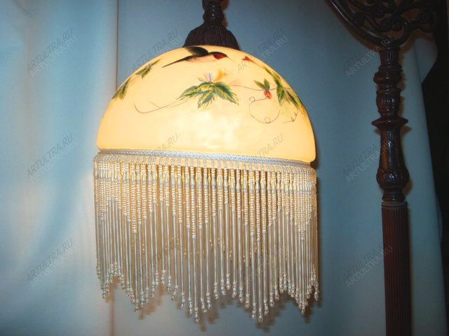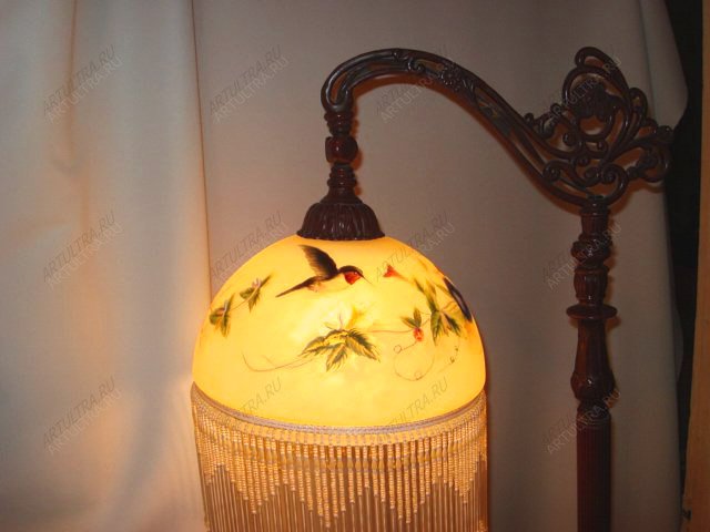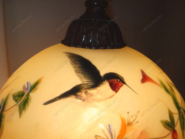 Роспись торшера подразумевает нанесение рисунка по всей поверхности абажура. Здесь изображена птица колибри в полете. Считается, что она приносит счастье в дом. Кроме того на светильнике изображены яркие экзотические цветы на янтарном фоне. Стиль модерн, не теряющий своей актуальности уже целый век, идеально впишется в любой интерьер, так как он способен ненавязчиво интегрироваться с любым дизайном. Такие торшеры будут уместны в спальнях, гостиных и детских комнатах. Витражные украшения для дома вошли в моду не так давно, но сегодня они заняли прочное место на рынке и в сердцах ценителей искусства. Если украшать свой очаг при помощи таких абажуров, то он станет не только модным и красивым, но еще получит ту самую теплую атмосферу, которая должна быть в доме, где всегда ждут родных и близких.
