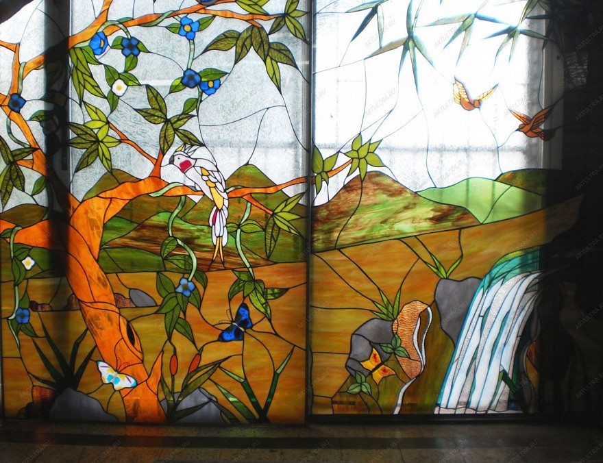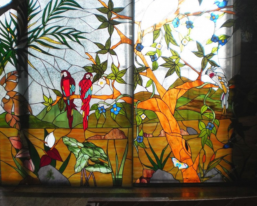 Шикарные витражи, что представлены на фото выше, созданы посредством технологии Тиффани, которая по праву является заслуженным лидером в витражном искусстве. Она получила свое название в честь ее создателя и основателя - художника и витражиста из США Луиса Комфорта Тиффани. Такая техника изготавливается вручную, отлично пропускает свет, а также позволяет создавать объемные и фактурные изображения.