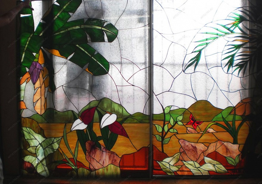 Шикарные витражи, выполненные в технике Тиффани, получившей огромную популярность, станут отличным уникальным декоративным оформлением для окон, о чем свидетельствует фото, расположенное выше. Такой витраж органично впишется в помещение практически любой стилистической направленности, т.к. представляет собой декор с чудесным пейзажным изображением, которое найдет свое применение в практически каждой комнате.