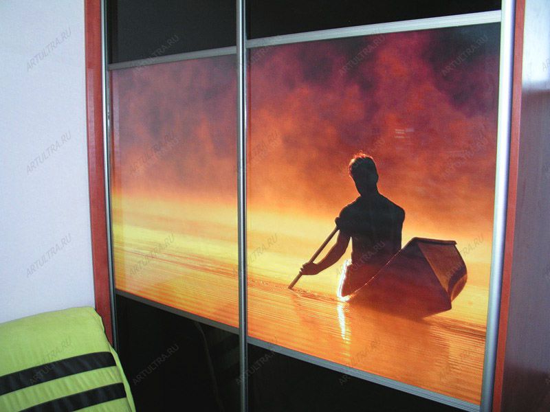 Это изделие представляет собой фотовитраж с пейзажем заката. На его фоне видна небольшая лодка и силуэт человека, который стремится к уходящему солнцу. Стилистическая направленность создает ощущение покоя и неторопливости. Теплая цветовая гамма и наличие черных поверхностей идеально гармонируют друг с другом. Пейзаж завершается переходом заката в ночь, что создает благоприятную атмосферу для последующего отдыха обитателей помещения.