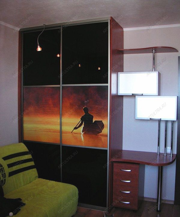 Шкаф-купе с фотовитражом нечасто можно встретить в интерьере жилых помещений. Дело в том, что технология, позволяющая создать подобное изделие, относится к инновационным. Изображение получают с помощью нанесения специальной краски прямо на поверхность, будь то пластик, стекло или зеркала. Нанесению краски предшествует обработка поверхности праймерами – специальными химическими веществами, улучшающими сцепление краски с поверхностью. Далее, с помощью специального устройства – плоттера, производится нанесение изображения. Затем краска отверждается путем ее облучения ультрафиолетовыми лучами. Данная технология позволяет получать четкие, насыщенные изображения практически на любых поверхностях.