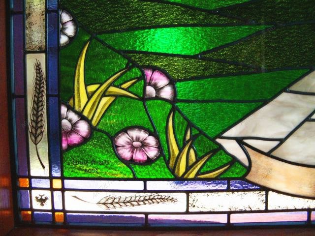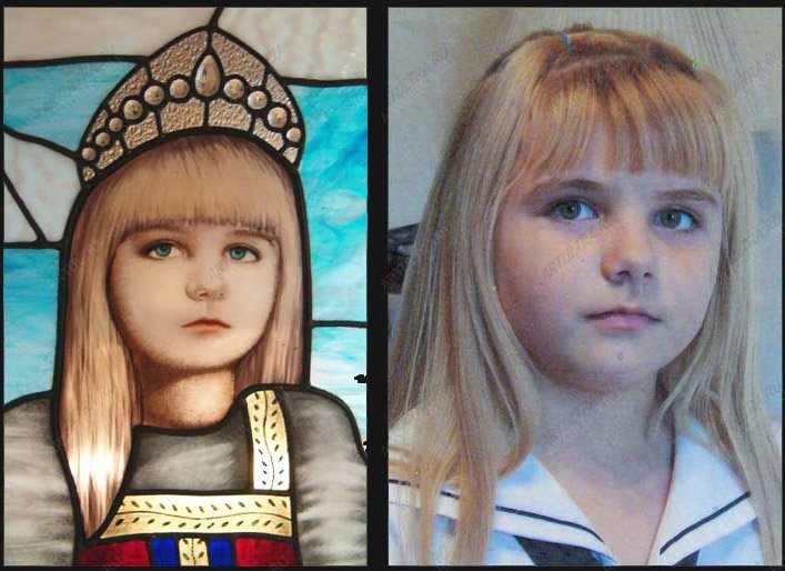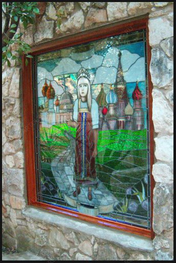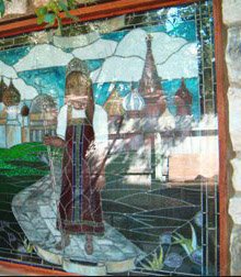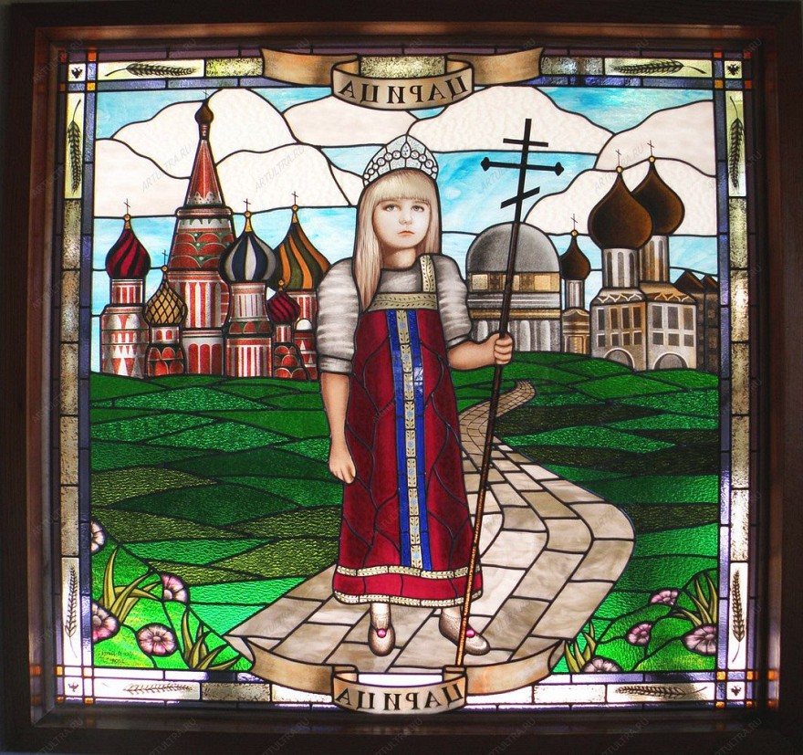Славянский витраж окунет вас в русскую историю, в эпоху древней Руси и творчество ушедших веков. Витражные окна вошли в обиход еще в семнадцатом веке, когда тематика рисунков была именно такой: цари, битвы и религия. На картине изображена юная царица, держащая в руке православный крест. За ее спиной изображен известный всему миру храм Василия Блаженного и купола древней православной церкви. Примечательно, что девочка одета в крестьянский наряд, что является символом близости к народу. Композиция состоит из 149 деталей, которые скрепляет особая пайка, а лента из меди удерживает всю конструкцию, делая ее более надежной. Витраж выполнен в технике Тиффани, которая позволила добиться мягкого перехода цвета, и придает объемности изображению. Акриловые краски, которыми расписан витраж, придают картине живость и реалистичные оттенки.