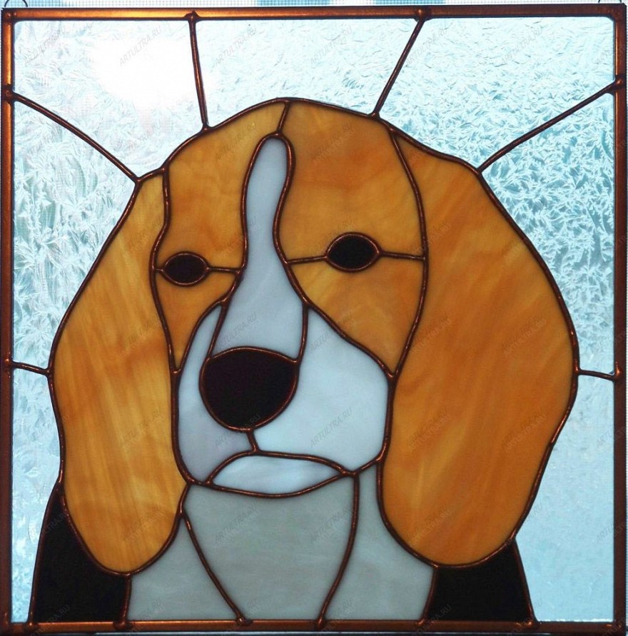 Учитывая все сказанное выше, не трудно провести аналогию с собакой на витраже – прежде всего она станет для вашего дома верным и надежным оберегом, преданным охранником вашего жилища, а также олицетворением самых добрых и ценных качеств на земле. Выполнен такой витраж из кусочков цветного стекла, которые оборачиваются медной лентой, после чего соединяются вместе с помощью оловянно-свинцового припоя. Срок изготовления такой работы составляет всего одну неделю. Предоставляемая гарантия на изделие - 12 лет.