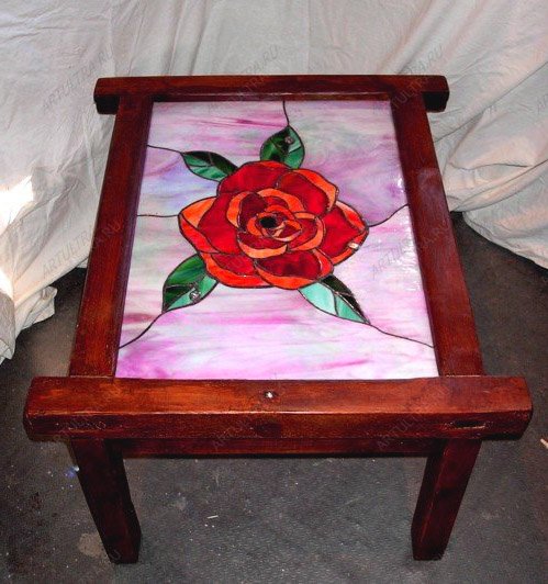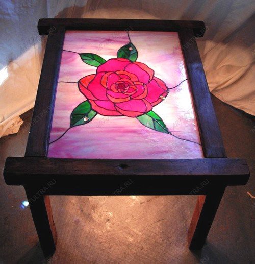 Стол с витражом – это оригинальный предмет мебели, который заставит ваш интерьер засиять новыми красками. Мебельные витражи давно вошли в моду и сегодня сложно представить дом, где хозяева, обладающие хорошим вкусом, обходятся без этого интересного предмета интерьера. Витражи в технике Тиффани - это тренд, который отлично вписывается в любой дизайн из-за своего оригинального вида. Стол с витражом с использованием данной технологии выглядит очень стильно и неповторимо. Алая роза на фоне закатного неба считается одним из лучших дизайнерских решений, которое будет уместным в любом доме, ведь давно известно, что роза - это символ любви и страсти. Кстати, такие столики можно использовать для свиданий.