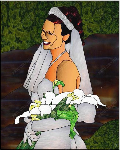 Свадебный витраж прекрасное решение для украшения ЗАГСов, ресторанов и прочих мест, которые, так или иначе, связаны с таким чудесным мероприятием как бракосочетание. На картине изображена невеста со свадебным букетом из нежных калл. Лицо девушки светится счастьем, свадебный наряд свеж и прекрасен, а фон наполнен сочной зеленью и солнечным светом. Свадебный витраж как нельзя точно отображает настроение этого волшебного и счастливого дня. Картина состоит из 89 деталей, но при этом относится к самым сложным работам по исполнению. Для соединения стекол в композицию использовался оловянно-свинцовый припой, а для упрочнения в изделие интегрирована лента из меди.