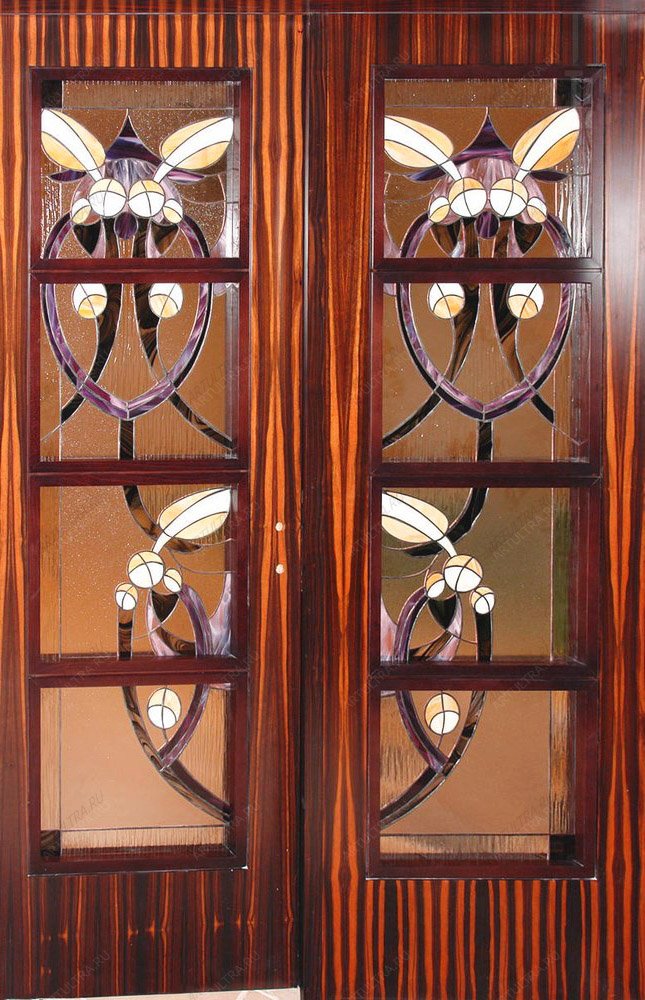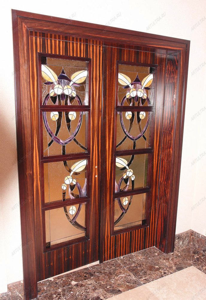 Возможности, которые открывает перед художником-витражистом данная технология, позволяют ему решить пространственные задачи любой сложности. Входной витраж в бассейн является ярким и акцентирующим элементом в дизайне помещения, ведь входная дверь - это своеобразная визитная карточка заведения. Двери, выполненные в технике Тиффани, подразумевают под собой дверную конструкцию и витражную вставку, которая настолько тонка и изящна, что создается впечатление вставленной в дверь стеклянной картины. Витражные вставки Тиффани придают дверям наиболее презентабельный и эффектный декоративный вид. Даже самая обычная и неприглядная дверь превращается в элегантный элемент интерьера.
