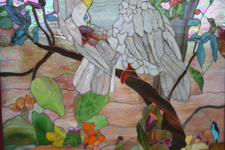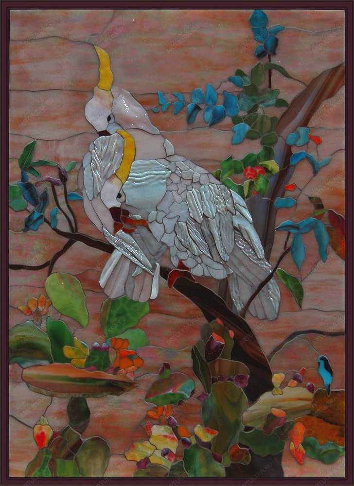 Витраж «Белый попугай», представленный на фото выше, создан в не теряющей своей популярности техники Тиффани. И это обусловлено рядом причин. Во-первых, данная техника позволяет выполнить более сложную детализацию за счет того, что имеет более тонкие швы, которые выполняются посредством оловянно-свинцового припоя. Во-вторых, в технике Тиффани используются даже самые мельчайшие детали более сложной конфигурации, нежели в других техниках. Также применяемая разной толщины медная лента позволяет получить нужную толщину шва для витража, тем самым дополняя рисунок определенными акцентами. Особенностью техники Тиффани является припой, за счет которого образуются выпуклости или небольшие колебания толщины, неровности, пузырьки и прочие признаки, по которым видно, что изделие является ручной работой, а не вышло из-под автомата. Ведь чем более не похожи композиции одна на другую, чем более причудливы они, тем наиболее они ценны и интересны, т.к. выполняются рукой чуткого мастера.
