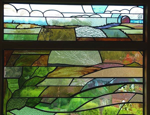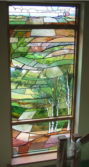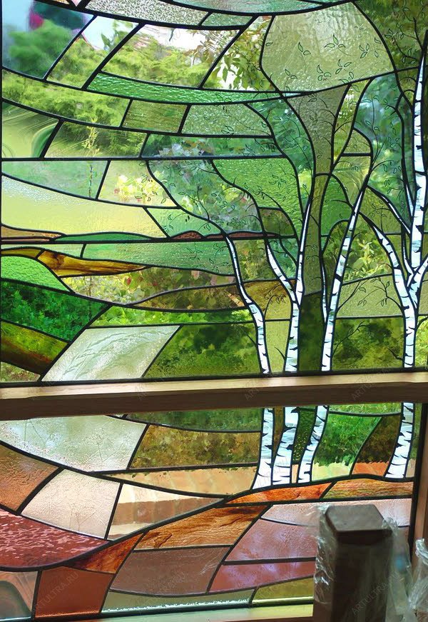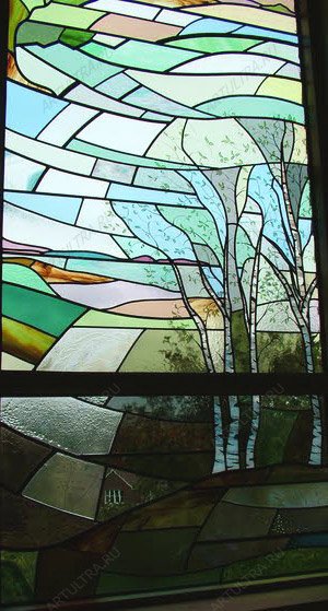 Витраж “Березы” олицетворяет собой легкость, воздушность, он выглядит очень ажурным. В зависимости от освещенности помещения, мы можем изготовить для вас витраж в более светлых либо немного затемненных тонах. На фотографиях изображено два витража, один символизирует весну, другой - лето. Если присмотреться, можно увидеть, что они оба разделены на три зоны: