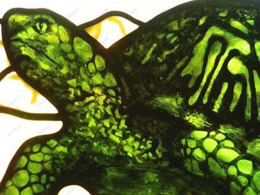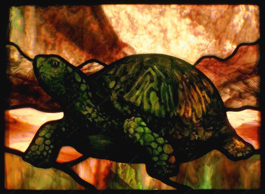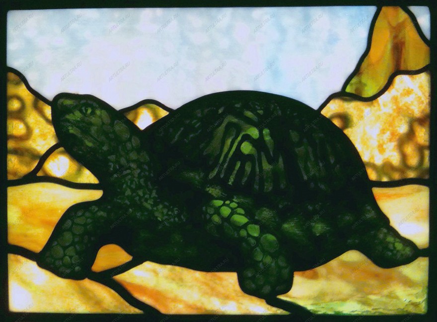 Витражная картинка с черепахой - изделие, выполнена в технике Тиффани и украшена авторской художественной росписью. Таким образом получается комбинированный витраж, который является наиболее интересным и эффектным в художественном значении. Техника Тиффани позволяет создавать необыкновенно реалистичные образы за счет того, что в процессе изготовления применяются стекла сложной формы – вогнутые и выпуклые, а также присутствуют даже самые мельчайшие стеклянные элементы, что позволяет создать объем и фактурность изображений. Роспись акриловыми красками также завоевала свое признание, т.к. позволяет создавать эксклюзивные и эффектные рисунки. Да и сама техника идентична работе с любыми другими видами красок, такими как гуашь или акварель. Краски смешиваются особым образом и накладываются друг на друга. А результат такого творения мы видим на картинках «Витраж черепахи», что на фото выше.