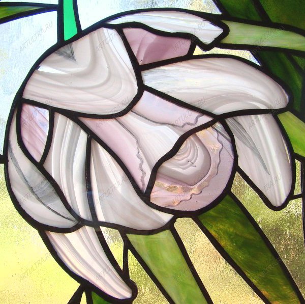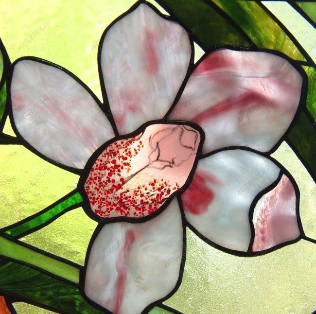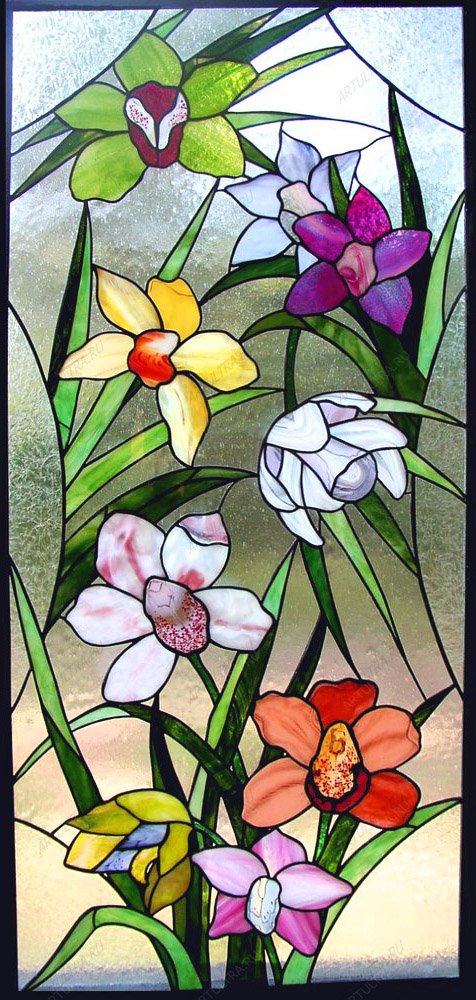 Витраж «Цветы» – нежный декор для вашего окна, выполненный в популярной техники Тиффани, о чем свидетельствует представленное фото. Он замечательно подойдет к любому дизайну, создав в помещении атмосферу комфорта и уюта.