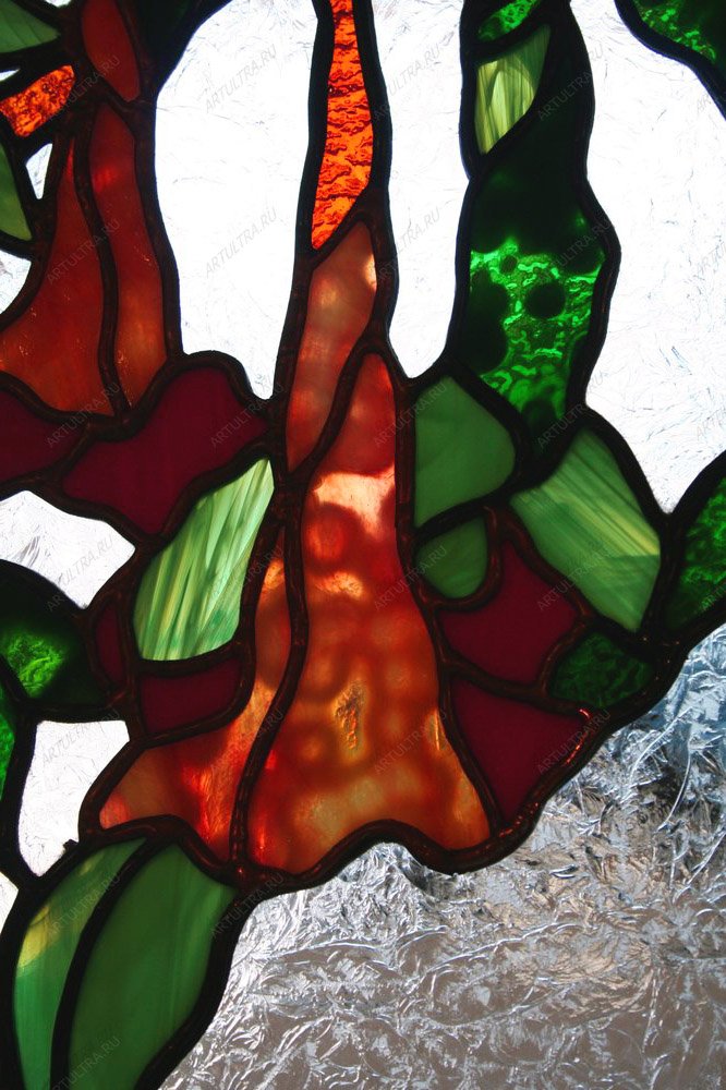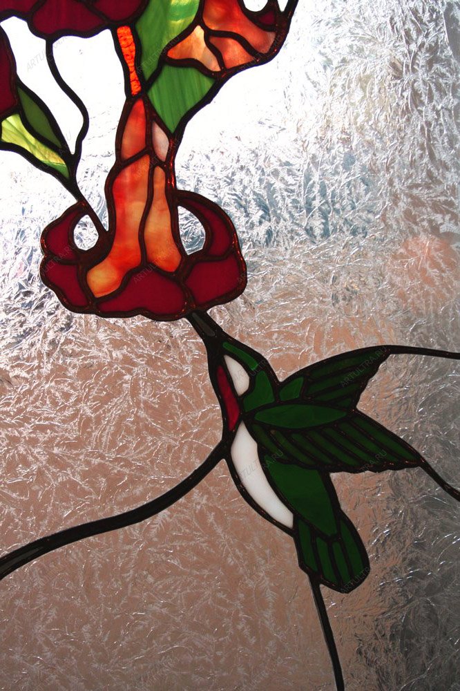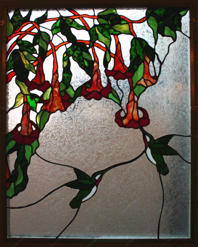 Витраж «Цветы и птицы» наполнит ваш дом упоением летнего дня и яркостью южных цветов. Искусство создавать окна из цветных кусочков стекла пришло к нам из глубины веков, но и сегодня эта традиция на пике моды. Фантастическую реалистичность и невероятную игру цвета картине придала популярная техника Тиффани. Семьдесят восемь элементов были тщательно обработаны стеклорезом и спаяны оловянным припоем, так как именно он считается самым надежным способом крепления. Лента из меди, интегрированная в композицию, выполняет сразу две функции: дополнительный декор и усиление прочности.