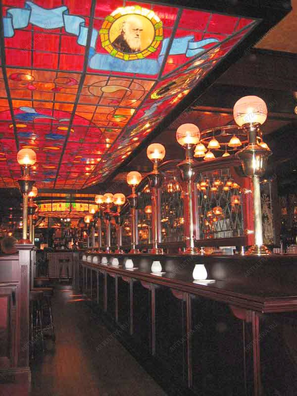 Витраж для бара сделает интерьер заведения оригинальным и утонченным. Звенящая красота цветных стекол выделит его среди остальных, а неповторимый декор зачастую является залогом успеха. Арочная мозаика, необычной формы потолок и декоративная подвеска над барной стойкой привлекут внимание каждого и наверняка запомнятся надолго. При создании витражей использовалась техника Тиффани, которая славится своей способностью наделять помещение живым цветом и неповторимостью. Семьсот восемьдесят деталей прошли тщательную обработку стеклорезом, чтобы все стеклянные фигуры соединились в правильный пазл без каких-либо огрехов. В единую композицию их собрал один из самых надежных припоев. Фольга из медной ленты стала завершающим штрихом, который дополнительно украсил изделие и придал ему прочности.