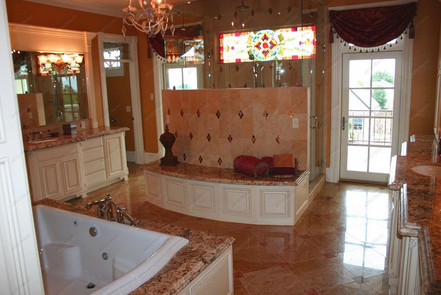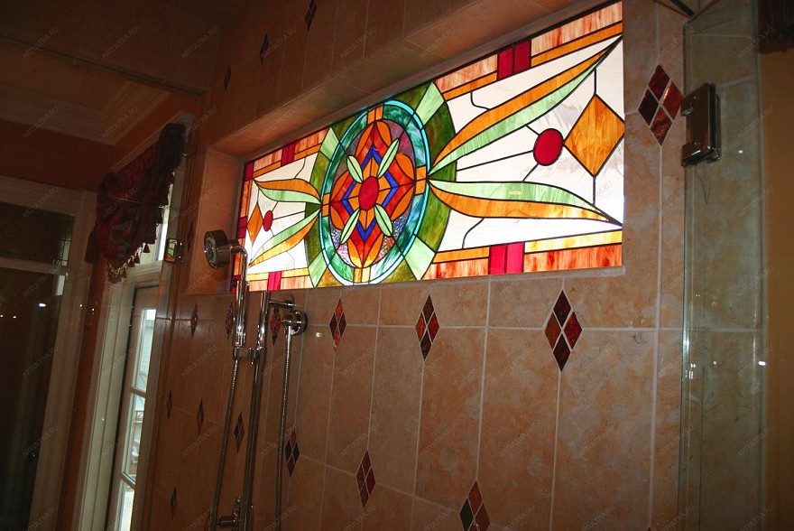 Витраж для ванной, который изображен на фото выше, относится к одним из многочисленных творений, выполненных в технике Тиффани, способной завораживать рельефом и фактурой деталей, а также «живостью» и реалистичностью создаваемых композиций. Витражная ниша очень часто используется для декоративного оформления темных помещений, т.к. визуально она способна расширить пространство, тем более, что обычно она оснащена подсветкой. Впрочем, и в светлых помещениях такие витражи в нишах не менее привлекательны, поскольку придают интерьеру уникальность и неповторимость.