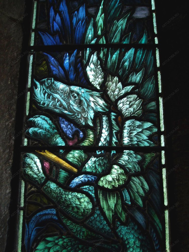 Витраж «Дракон» выполнен в торжественной и величественной манере. Именно такие драконы были изображены на щитах древних королей и рыцарей. За счет мастерского исполнения картина обладает завораживающей реалистичностью и душой. Такой эффект получился благодаря технике Тиффани, которая популярна именно из-за этих удивительных свойств наделять картины жизнью. Восемьдесят шесть деталей были кропотливо обработаны стеклорезом, поэтому огрехи и зазоры полностью исключены. Оловянный припой собрал мозаику воедино, сделав ее практически монолитной. Лента из медной фольги стала дополнительным украшением и усилила конструкцию, сделав ее более надежной, а акриловые краски дали живой мерцающий свет.