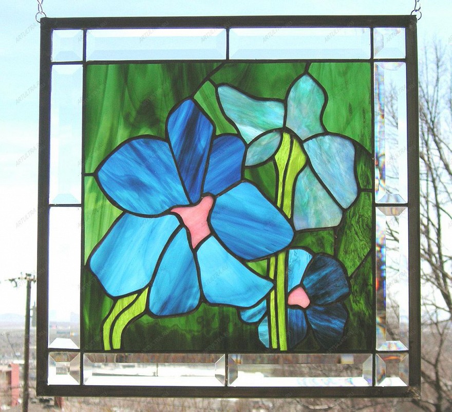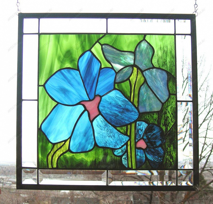 Витраж «Голубые цветы» станет хорошим современным декоративным элементом вашего интерьера, способным значительно преобразить обстановку в комнате, добавить ей выразительности и красочности, а возможно даже стать ярким акцентом всего дизайна в целом.