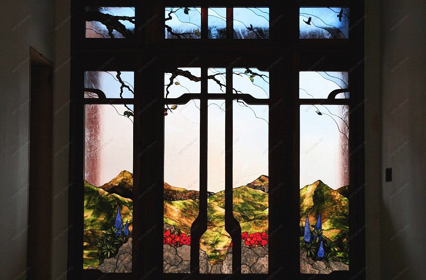 Существенным плюсом витража «Горы» является также и то, что он не требует какого-то особенного ухода. Для поддержания его в надлежащем виде необходимо периодически протирать его мягкой тканью с использованием средств для мытья стекол.