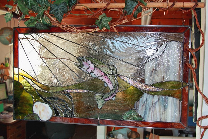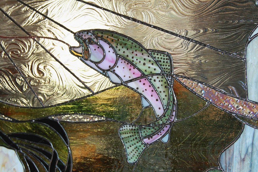 Витраж с картинкой рыбы выполнен в реалистичной манере. Прозрачные волны, изумрудное дно и сама рыба кажутся наполненными движением и светом. Все благодаря тому, что изделие выполнено в технике Тиффани, которая известна своим уникальным свойством придавать изображению стереоэффект. Картина состоит из 69 деталей, прошедших кропотливую обработку стеклорезом, в результате дается гарантия того, что неточности исключены. Оловянно-свинцовый припой надежно соединяет стекла, а это значит, что картина прочна и долговечна. Медная лента является обязательным элементом витража в указанной технике и выполняет функцию усиливающего элемента.