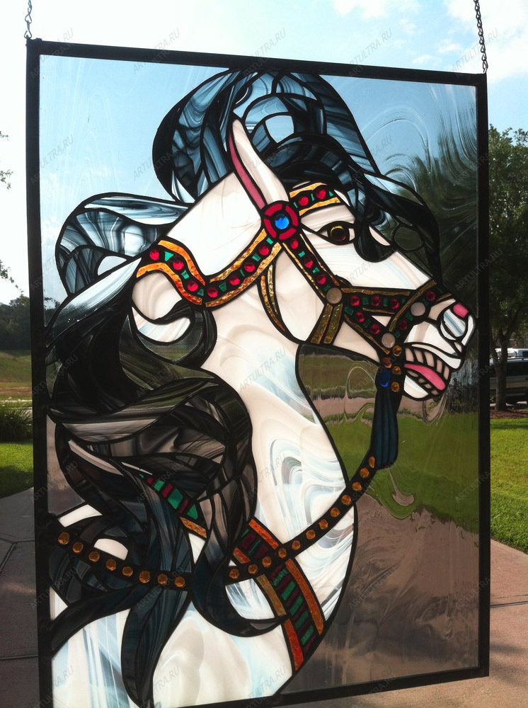 Витраж «Конь» - великолепная картина, которая органично впишется в стилистику любого интерьера. Такой декор можно разместить как в гостиной, так и в прихожей или, например, дополнить им интерьер вашей кухни. Витраж будет чудесно смотреться в любом помещении и станет достойным его украшением.