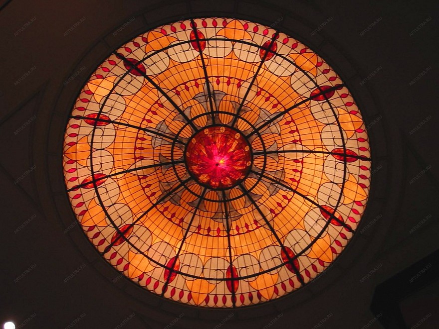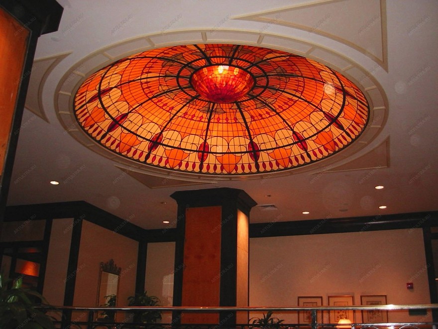 Несмотря на сложность и внушительность конструкции, ухаживать за витражом для круглого потолка достаточно просто. Нужно лишь мыть его по мере загрязнения мягкой тканью или специальными салфетками для стекла, тогда он прослужит много лет. В наше время необходимо подтверждать статус заведения при помощи грамотно подобранного интерьера, поэтому, если воспользоваться таким декором, то вероятнее всего его положение взлетит на недосягаемую высоту.