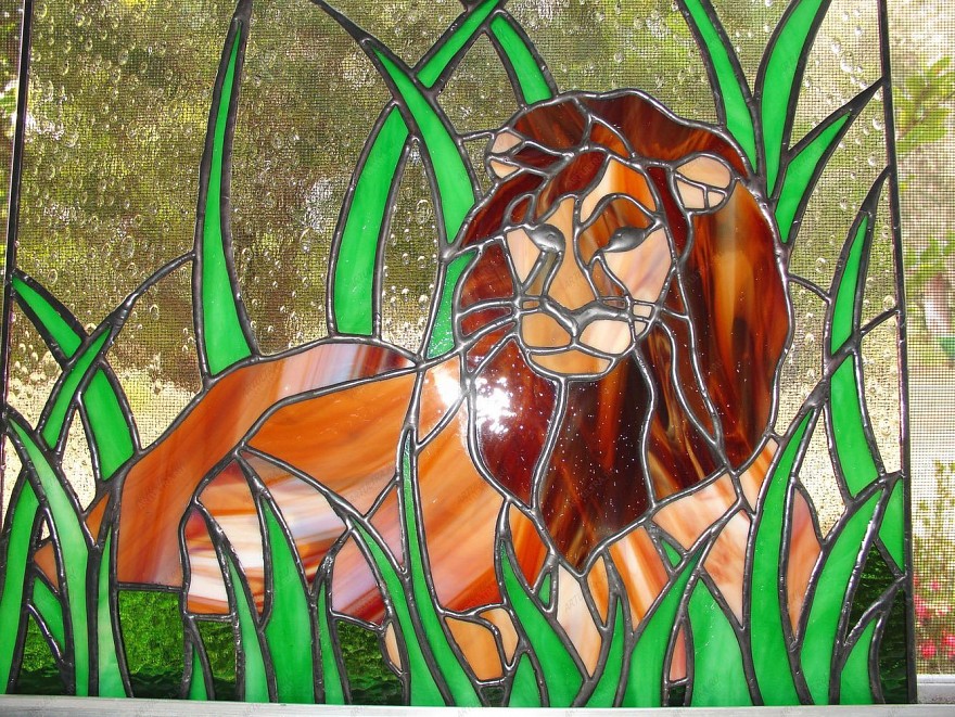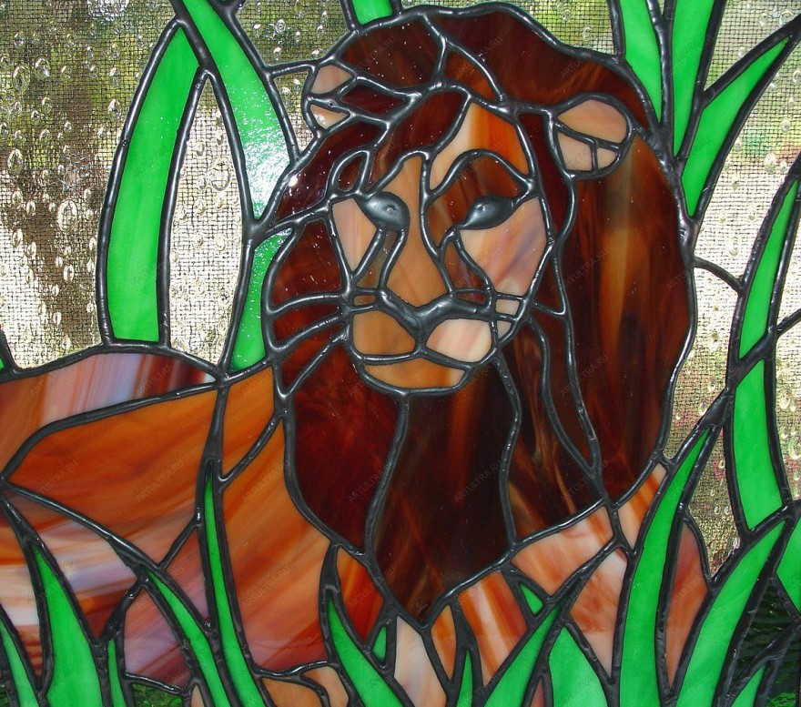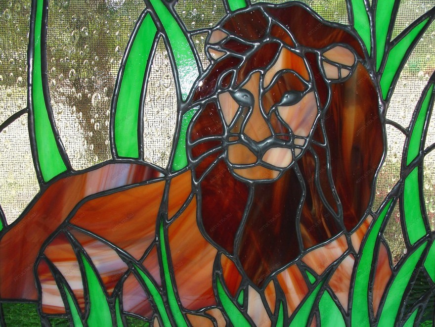 Витраж «Лев» исполнен в демократичном стиле модерн, который с легкостью вписывается в любую обстановку, дополняя ее. Поэтому такая картина будет уместна в любом помещении: на кухне, в спальне, в гостиной и даже в детской комнате, ведь малышу наверняка понравится засыпать под охраной царя зверей. Прозрачный, с янтарным оттенком общий фон позволит зрительно увеличить пространство, а ярко-зеленая трава привлекает внимание и немного разбавляет общий спокойный тон картины. При выполнении изделия использовались материалы надежной марки Spectrum и самое современное оборудование, поэтому можно с уверенностью сказать, что витраж абсолютно безопасен для здоровья, так как не является токсичным и устойчив к повреждениям.