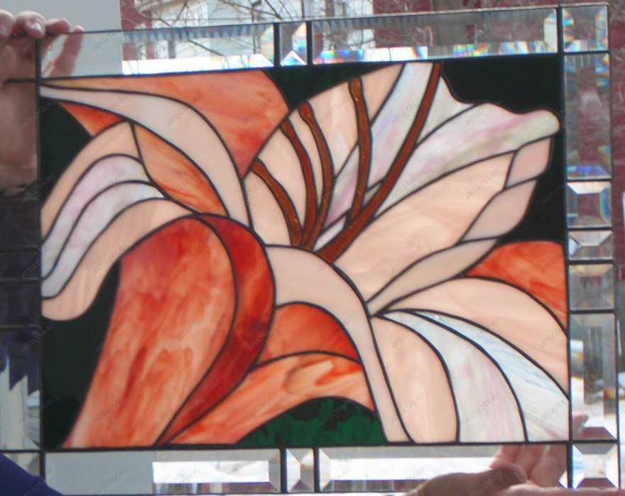Витраж «Лилия», фото которого представлено выше, выполнен с применением известной и популярной техники Тиффани, а для придания изделию особого изящества использовалось фацетирование – способ обработки кромки стекла, осуществляемый путем среза фаски под заданным углом. В результате на краях образуется скошенная грань. Работа выполнена из цветного прочного стекла марки Spectrum.