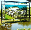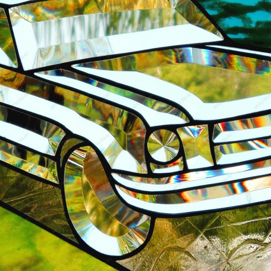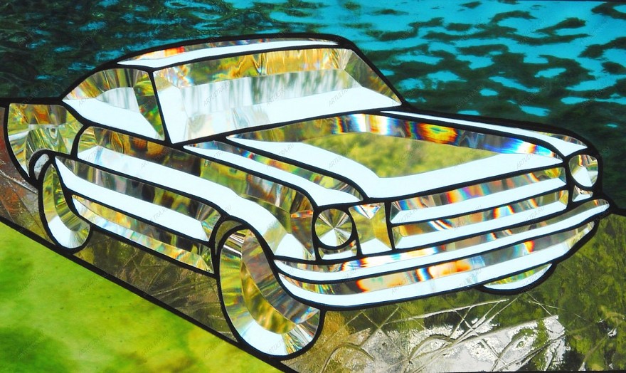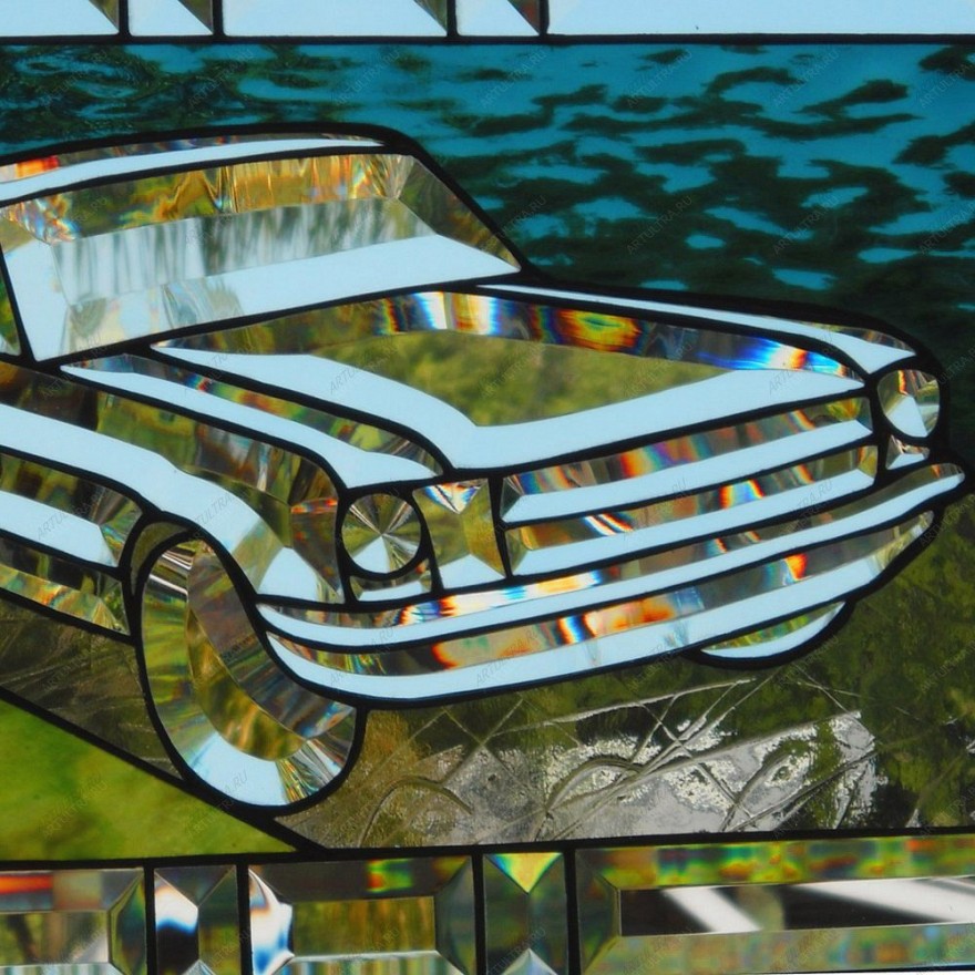 Витраж «Машина» способен стать одним из самых оригинальных и притягивающих взгляд украшений вашего дома. Автомобиль на фоне зеркальной водной глади и яркой травы выглядит объемным и очень реалистичным. Каждая деталь искусно создана, поэтому машина кажется очень похожей на оригинал. Такого эффекта позволила добиться одна их самых красивых витражных техник – фацетирование. Переливающееся стекло после особой обработки превратилось в настоящее произведение искусства.