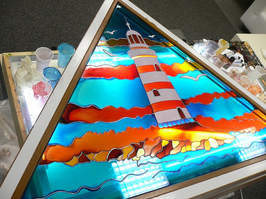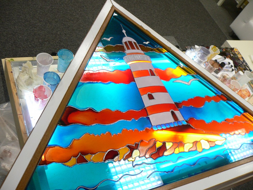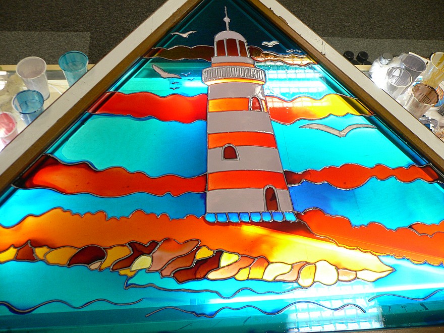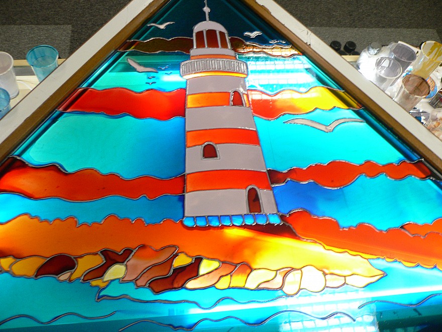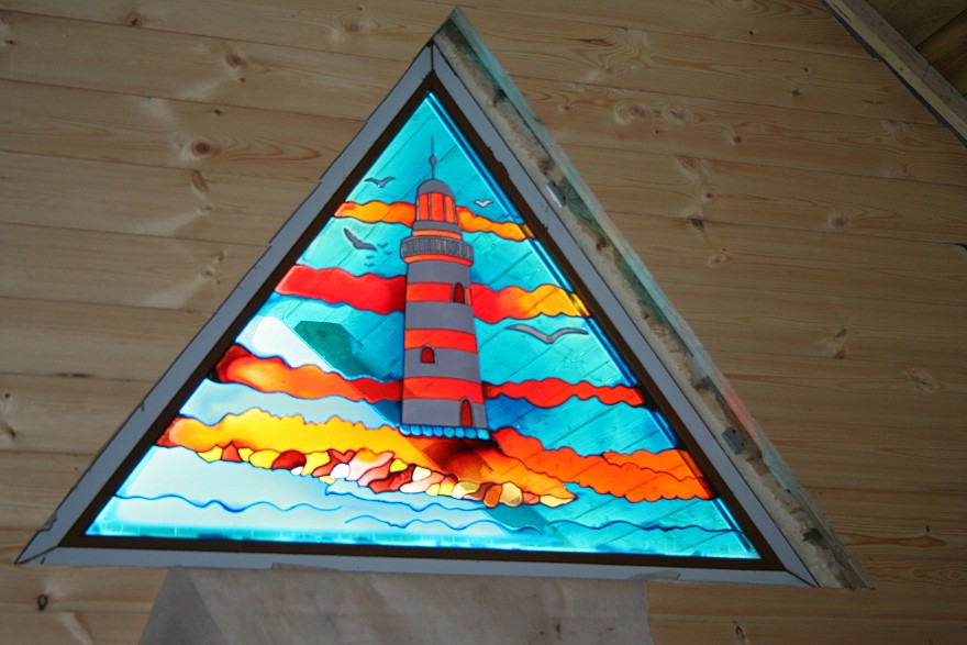 Примечательно, что маяк всегда считался символом надежды и ожидания, ведь именно благодаря нему моряки находят путь домой даже в страшную бурю. Силикатные краски, которыми нарисована картина, считаются самыми надежными, ведь после того, как рисунок раскрашен, его обжигают в специальной печи для придания стойкости. Стиль, в котором выполнен витраж «Маяк», прекрасно вливается в любую обстановку, поэтому такое окно успешно интегрируется в ваш интерьер, не нарушая его органичности. При солнечных лучах витраж начинает светиться, а яркие цвета красиво переливаться, создавая иллюзию настоящего заката.