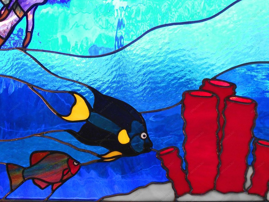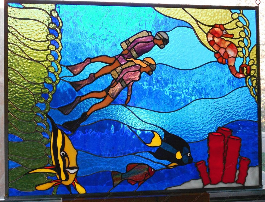 Витраж «Морская тема» выполнен в популярном стиле кантри, который появился не так давно – около 30 лет назад, но прочно завоевал лидирующие позиции, так как славится своей простотой и неброской красотой. Основное преимущество кантри – возможность его сочетания с любым стилем, мягко дополняя его. Рисунок изображает двух аквалангистов, исследующих яркий подводный мир с его удивительными обитателями. Насыщенная цветовая палитра заставит любое помещение преобразиться и «заиграть». При создании картины использовались качественные стекла марки Spectrum и современная технология пайки, поэтому изделие является абсолютно безопасным для здоровья и очень долговечным.